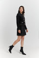 Raffinement absolu et allure parisienne. Cet ensemble deux-pièces en tweed soyeux noir structuré se compose d’une veste droite à col rond, fermée par une rangée de boutons dorés au design travaillé, et d’une jupe courte assortie.